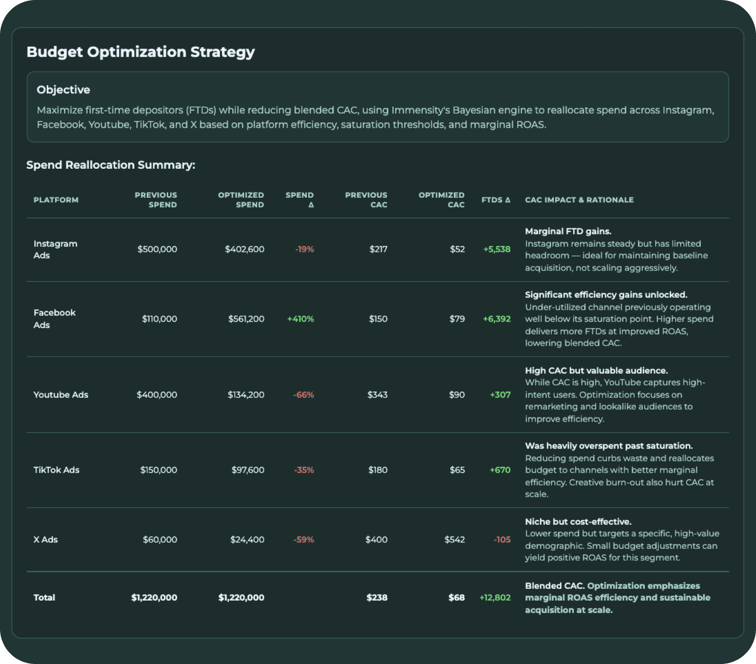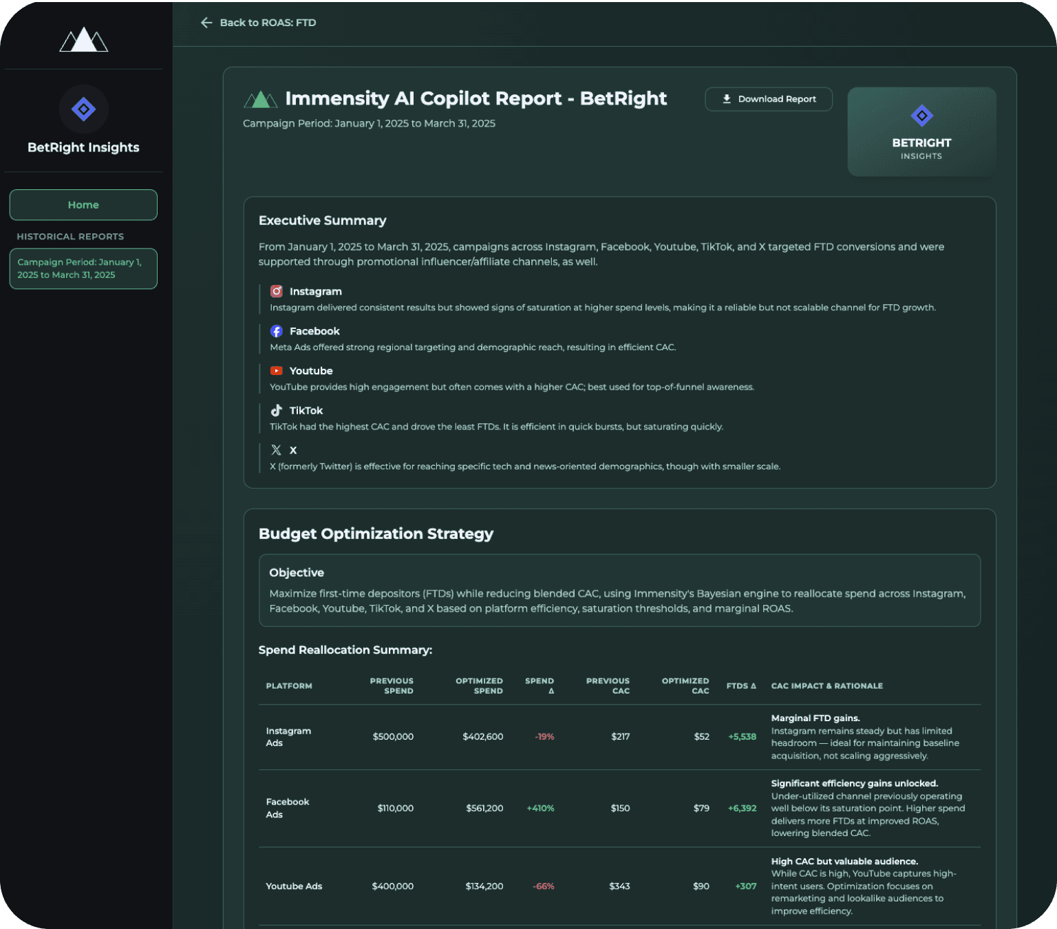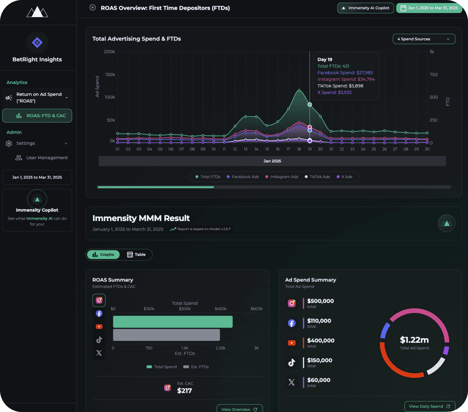 Immensity builds bespoke AI models trained on your marketing and player data — measuring real outcomes like deposits, retention, and ROI.